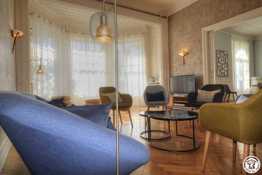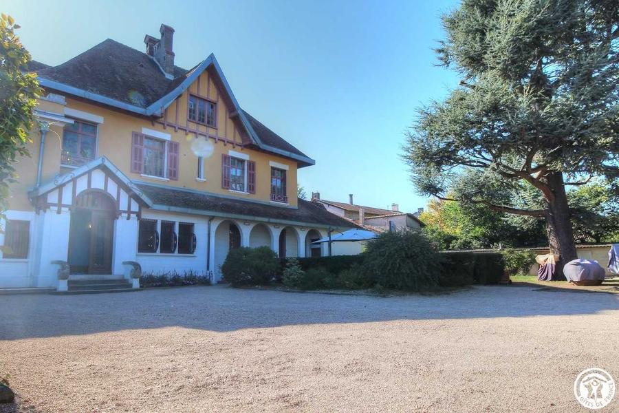 This Art Deco house combines charm and comfort, with an atmosphere of years gone by. The house is located in a suburban area, with a private garden, parking and secure access to enjoy the peace and quiet. As soon as you open the front door, the scene is set with a parade of shimmering colours. At the entrance, on your left is the heated indoor swimming pool, secure and unique with its wooden deck; on your right is the exceptional reception hall with its stained glass windows, fireplace (with insert and working), grand wooden staircase leading to the bedrooms and gigantic crystal chandelier. The hall leads directly to the large lounge with its bow window, and the elegantly decorated dining room. From the hall, on your left, a corridor leads to the kitchen with a French window giving direct access to the garden. Comfortable, functional kitchen with adjoining utility room. Separate WC. Upstairs are the 5 bedrooms, each with its own distinctive character, with extravagant bathrooms and private WC. The half landing leads to the small private lounge and the Louise Brooks bedroom (two single beds or one double bed). A few steps lead down to a large corridor that leads to the 4 bedrooms on either side: Joséphine Backer (2 single beds or 1 double bed) with private terrace and views over the Saône, Coco Chanel (2 single beds or 1 double bed) in crimson, Mistinguett (4 single beds or 2 bunk beds) and