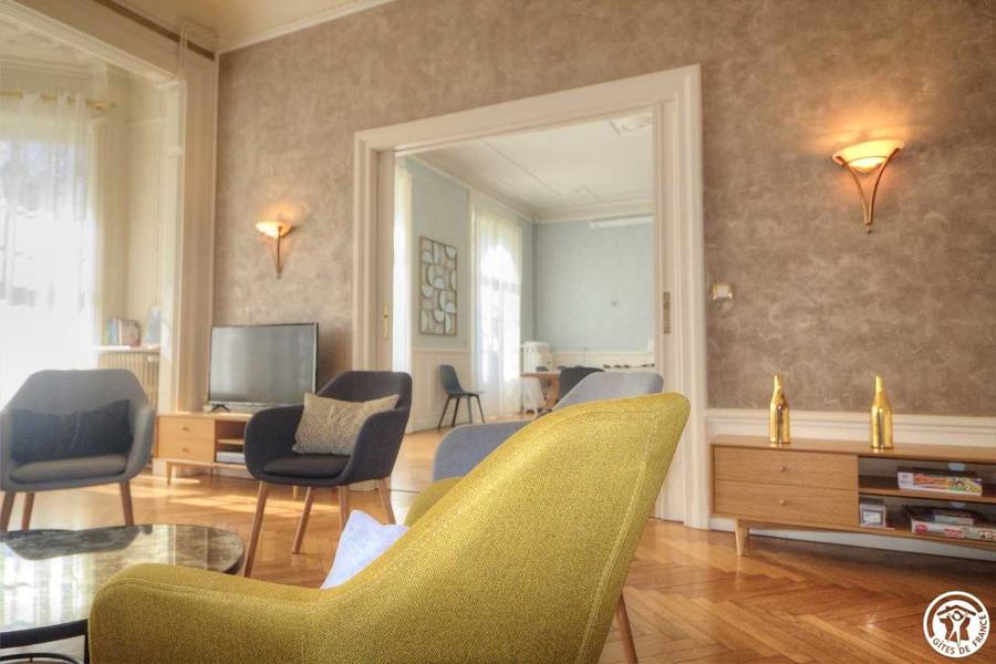 In the heart of the village of Montmerle-sur-Saône, this 1920 bourgeois house with indoor swimming pool can accommodate up to 15 people in its 5 bedrooms upstairs.