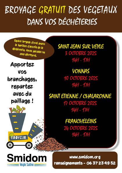 Broyage gratuit dans vos déchèteries, venez en profiter ! Apportez vos branchages, repartez avec du paillage. Espace broyage situé avant la barrière d'entrée de la déchèterie, aucun passage ne sera décompté.