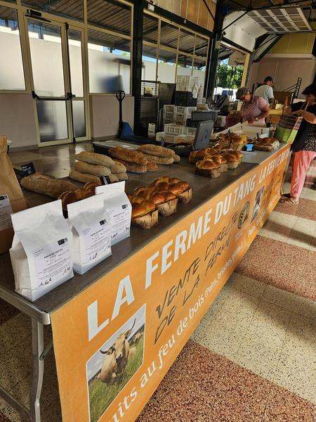 Venez découvrir les produits de la ferme du Tang, vendus lors de ventes exceptionnelles : ses vaches Aubrac (veaux sous la mère) et volailles. Il vend aussi tous les week-ends sa farine bio, ses pains, brioches, tartes, pizzas cuites au feu de bois.