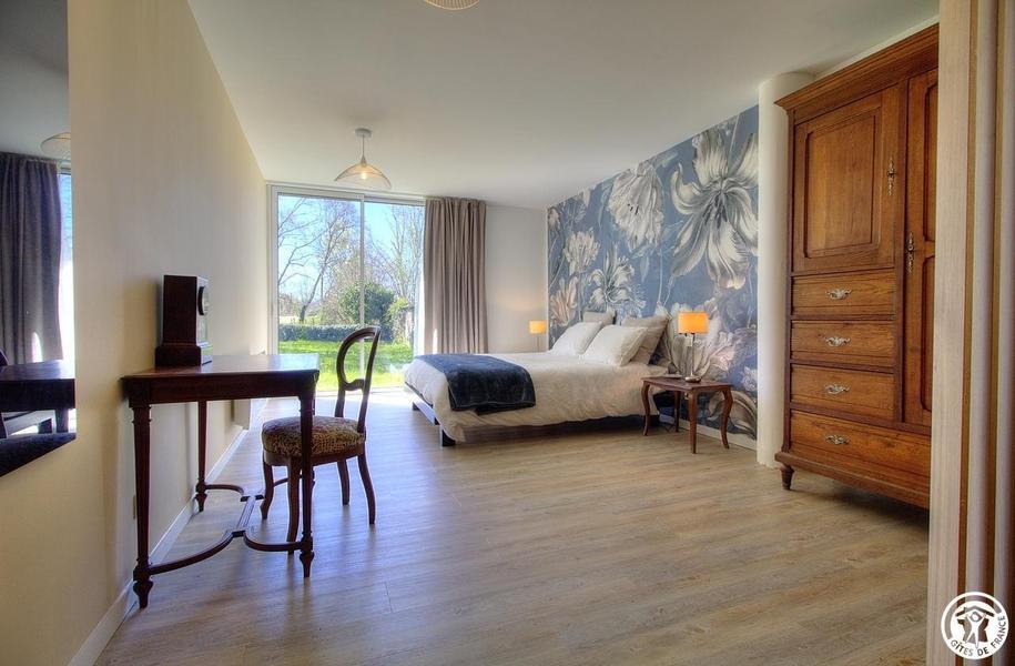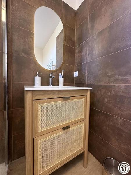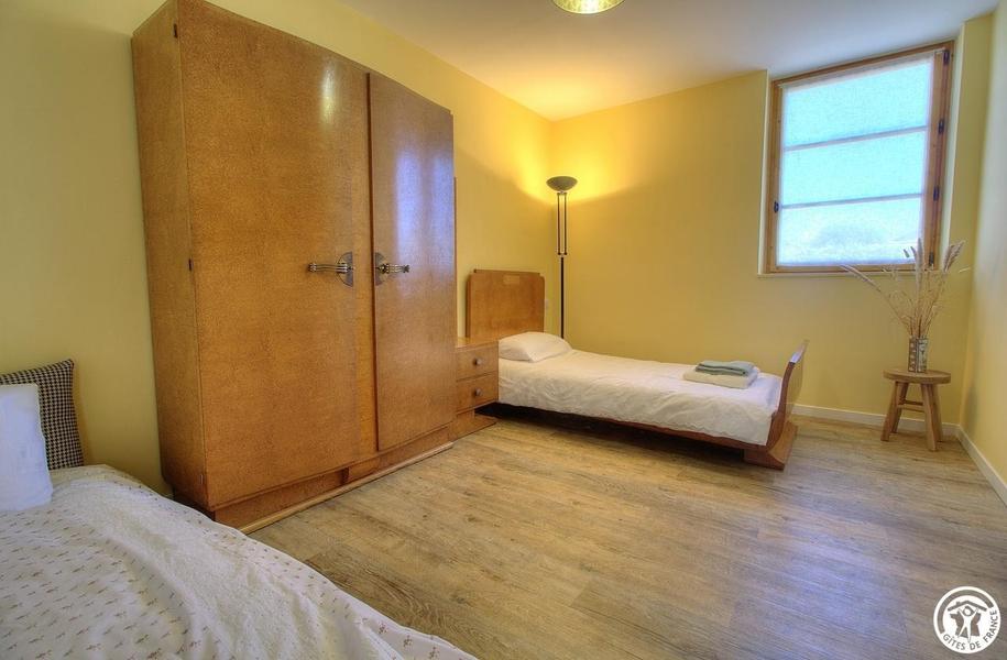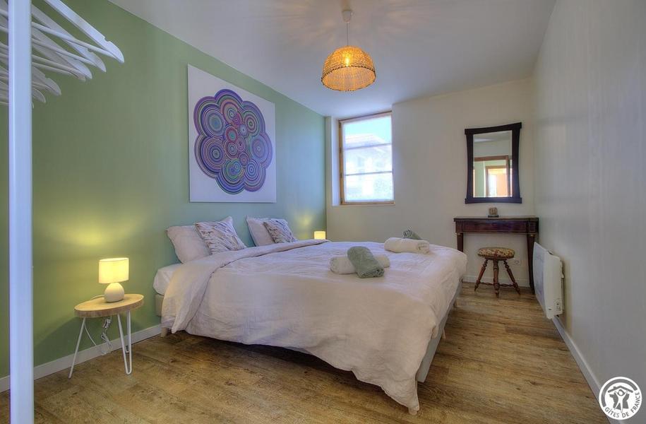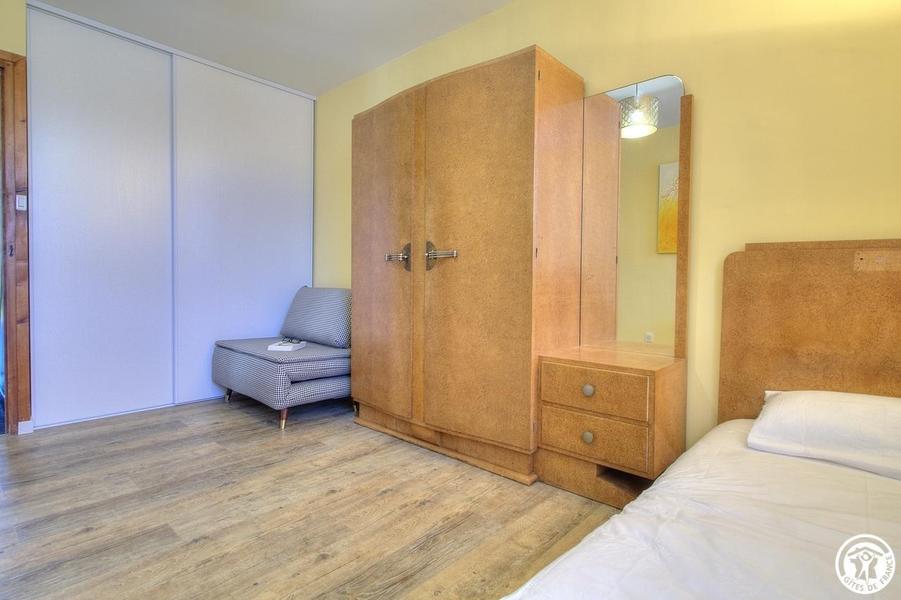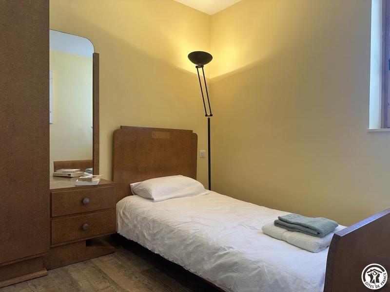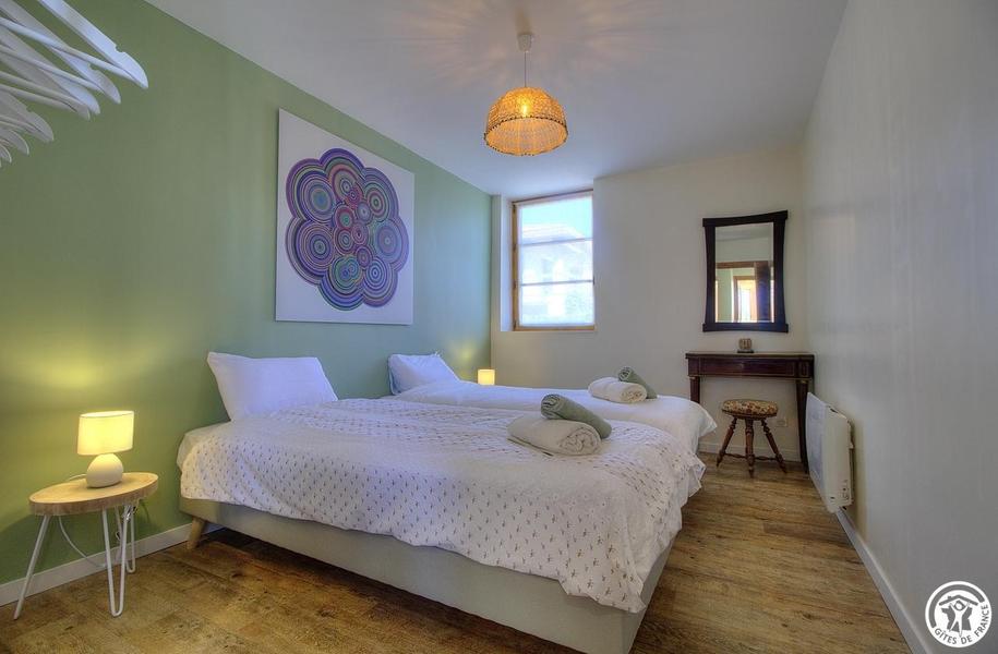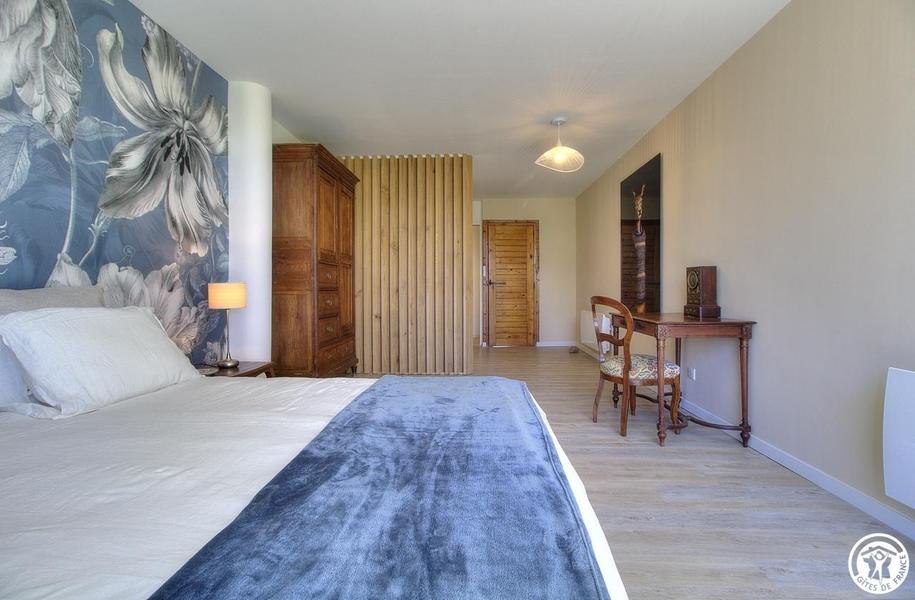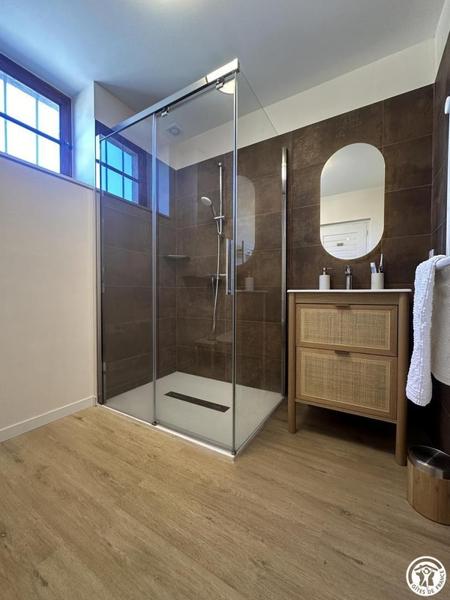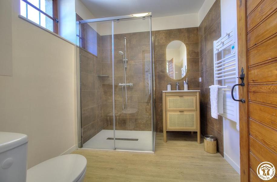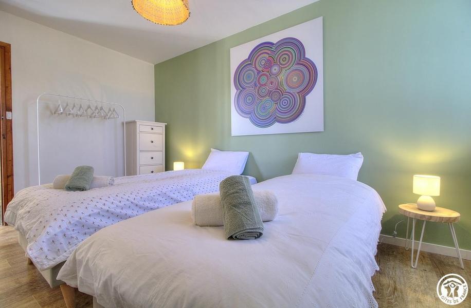 De plain-pied : hall d’entrée, cuisine ouverte, salon-séjour avec accès direct à la terrasse. Trois chambres, dont une suite parentale avec salle d’eau ouverte sur la chambre et WC indépendant. Deux autres chambres équipées de 2 lits en 90×200, d’un lit en 90×190 et d’une chauffeuse de qualité en 100×190. Seconde salle d’eau avec WC.