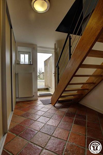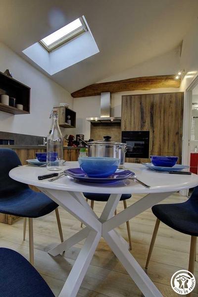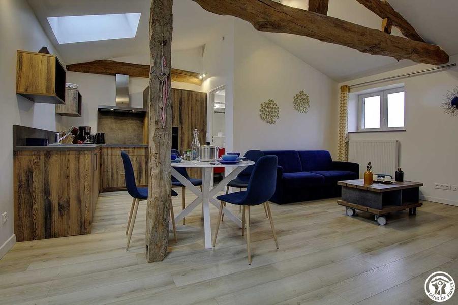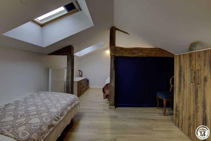 A proximité de Saint-Didier-sur-Chalaronne, dans le petit hameau de Challes, le Gîte Le Grenier de Bussière, de 65 m², est situé dans un ancien corps de ferme en L et peut accueillir jusqu'à 5 personnes, dans une décoration chaleureuse et moderne avec tout le confort. L'entrée se fait depuis une petite terrasse privée du Gîte et donne sur un hall d'entrée avec de nombreux rangements. Un escalier intérieur mène à une grande pièce de vie avec une très belle charpente en bois, composée d'une cuisine équipée et ouverte sur l'espace repas, un coin détente avec canapé convertible ainsi qu'un petit espace bureau. Fenêtres et velux sont équipés de volets roulants solaires, permettant d'occulter la lumière et le rayonnement du soleil l'été. Par une porte coulissante, vous découvrirez une chambre avec un lit simple (90x190) et un lit double (160x200) tout en gardant l'intimité de chacun grâce à la semi-séparation. Une salle d'eau avec WC complète cet hébergement. Chauffage au gaz inclus. Concernant les extérieurs, le Gîte dispose d'une petite terrasse privée avec une table et un banc en bois, à l'ombre le midi et le soir. Les propriétaires partagent leur piscine de grande taille de mi-mai à mi-octobre avec un accès de 10h00 à 19h00. Le remplissage de l'eau de la piscine et son usage par les locataires peuvent être restreints en application des arrêtés « sécheresse » de la préfecture de l'Ain. Espace jardin comprenant des transats et/ou bains de soleil. Parking sécurisé dans la cour de la propriété. Le plus de ce gîte : les lits sont faits à votre arrivée, le linge de toilette est fourni et les charges sont incluses. Idéal pour découvrir les nombreuses richesses naturelles et patrimoniales du Val de Saône. Pour un weekend ou un séjour plus long, pour les petits et les grands, de nombreuses activités à la portée de tous sont accessibles grâce à des sentiers balisés, des circuits pédestres ou à vélo. Les amateurs de baignade découvriront le Lac de Cormoranche-sur-Saône.